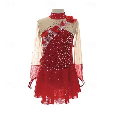 Abito da pattinaggio artistico Per donna Ragazze Pattinaggio sul ghiaccio Vestito Rosso Patchwork Foro per il pollice Rete Spandex Elasticizzato Allenamento Professionale Competizione Vestiti da