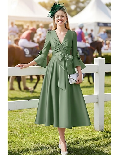 Linea ad A Lunghezza Tè Vestito da Festa Abito da Cocktail Abito da invitata a nozze Abito da cerimonia per signora Manica 3/4 Scollo a V Elegante Formale Ospite di nozze Ricevimento di matrimonio