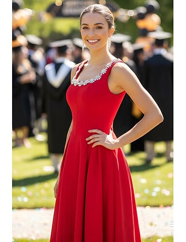 Linea ad A Lunghezza Tè Abiti da Ballo Elegante Festa Senza Maniche Scollo Tondo Formale Ritorno a casa Tasca Crepe Elasticizzato con Perline