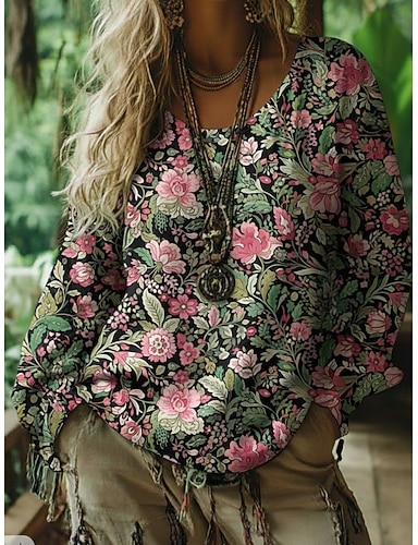 Per donna Camicia Boho Maglietta bohémien Maglietta Stampato Floreale Vintage Etnico Casual Manica Lunga Girocollo Top Regolari Quotidiano Weekend Abbigliamento da vacanza Rosa Estate Primavera
