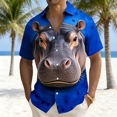 Per uomo Animale Divertente Ippopotamo Camicia Camicie hawaiane Camicia Aloha Manica Corta Hawaiano Vacanza Ferie Estate Collo ripiegato Stampa 3D Una tasca anteriore Camicia tipo lino Blu