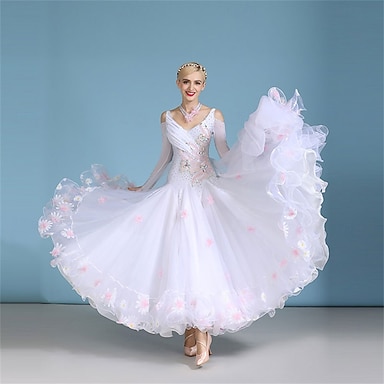 abito da ballo da sala da donna, elegante abito da competizione in organza a strati con applicazioni floreali e strass, per valzer, tango, foxtrot – bianco
