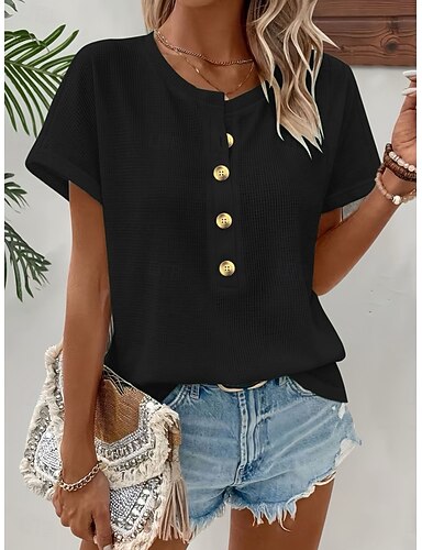 Per donna Maglietta Bottoni Semplice Moda Elegante Classico Manica Corta Girocollo Top Regolari Quotidiano Uscire Weekend Blu Nero Rosso Estate Primavera