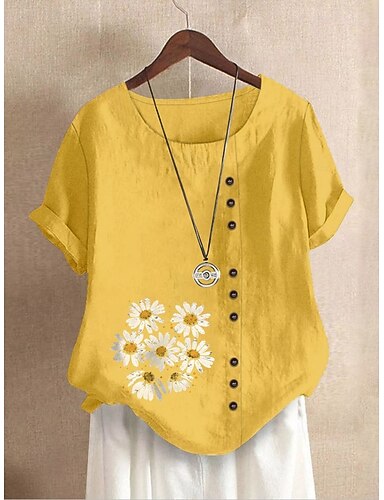 Per donna Camicia Blusa Finto cotone e lino Stampato Floreale Grafico Casual Manica Corta Girocollo Top lunghi Quotidiano Bianco Giallo Blu marino Verde Estate Primavera