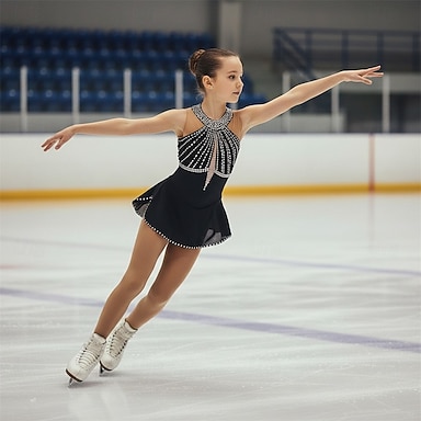 Abito da pattinaggio artistico Per donna Ragazze Pattinaggio sul ghiaccio Vestito Nero Patchwork Schiena aperta Rete Spandex Elasticizzato Allenamento Professionale Competizione Vestiti da