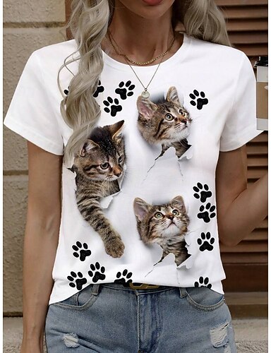 Per donna Maglietta Stampato Grafico Animale Gatto Elegante Classico Casual Manica Corta Girocollo Top lunghi Quotidiano Bianco Marrone Estate Primavera