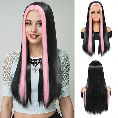 Parrucche sintetiche Diritto naturale Frangetta dritta Parrucca 24 pollici Pink + Red Capelli sintetici Per donna Rosa