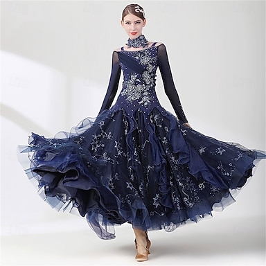 abito da ballo da sala da donna in organza a strati con ricami stellati e strass, elegante abito da competizione per valzer, tango, foxtrot – blu notte