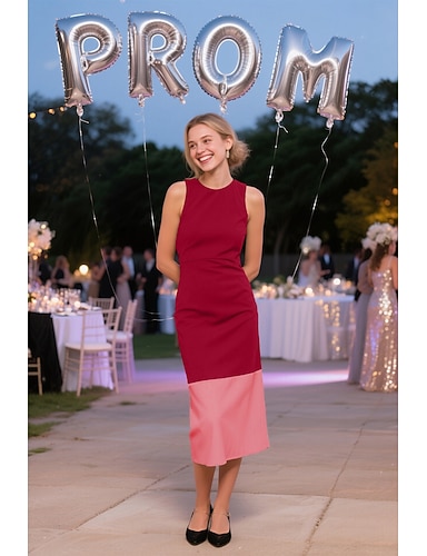 Tubino Colonna Lunghezza Tè Abito da Ballo Abito da invitata a nozze Abito da sera Abiti da Ballo Elegante Senza Maniche Girocollo Balli di fine anno Formale Crepe Elasticizzato con Blocco di Colore