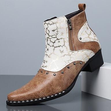 Stivaletti da uomo in stile western, marroni e bianchi, con cerniera laterale, tacco a blocco, perfetti per uomini alla moda, ideali per rodei, festival musicali, feste e occasioni speciali.