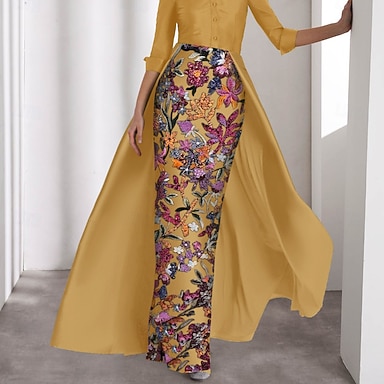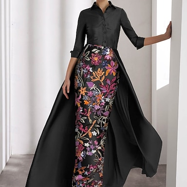 Tubino Colonna Lunghezza al pavimento Perline ricamate Abito Formale Abito da madre della sposa Abito da Sera Abito da ballo con sopragonna Abito formale Elegante Vintage Monocolore Manica Lunga