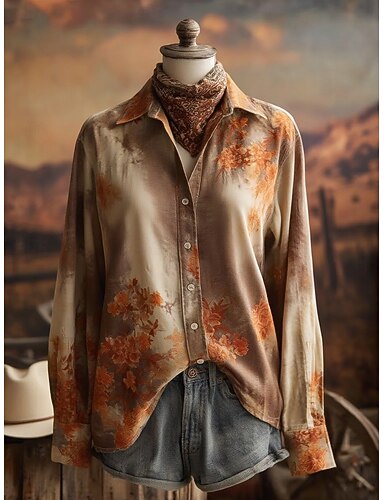 Per donna Camicia Blusa Bottoni Stampato Floreale Elegante Casual Manica Lunga Colletto a Camicia Top Regolari Quotidiano Blu Arancione Estate Primavera Autunno