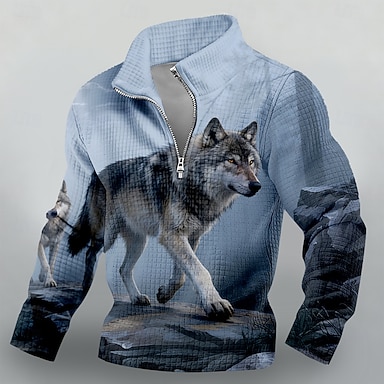 Per uomo Lupo Nido d'ape Felpa Moda Quotidiano Da caccia Collo alla coreana Zip a un quarto All'aperto Abbigliamento casual alla moda Viaggio Campeggio Blu Viola Blu scuro Con zip Autunno Inverno