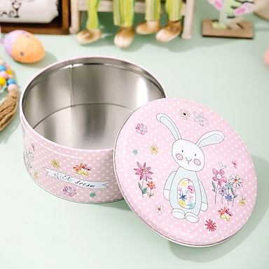 Scatola di latta rosa a forma di coniglietto pasquale, contenitore di caramelle e biscotti in metallo a pois, scatola regalo per bambini con coniglio