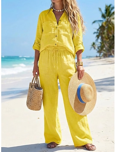 Per donna Camicia Set di biancheria in cotone Set da due pezzi Pantaloni di Lino Pantaloni Manica Lunga Scollo a V Tinta unica Moda Streetwear Ferie Abbigliamento quotidiano Nero Bianco Blu marino
