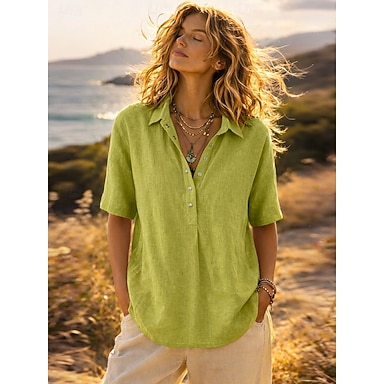 Per donna Blusa Camicia in finto lino Bottoni Tinta unica Vintage Elegante Casual Mezza Manica Colletto a Camicia Top Regolari Quotidiano Blu Nero Bianco Rosa Verde Estate Primavera Autunno