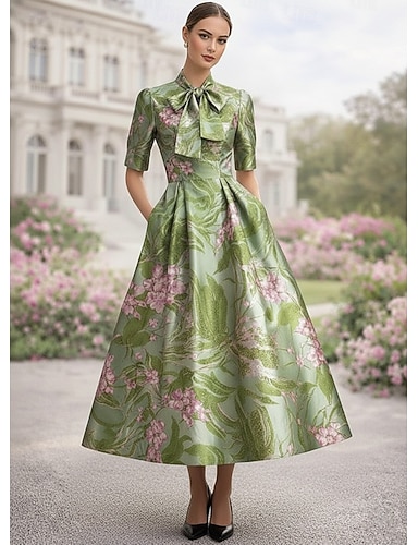 Linea ad A Lunghezza alla caviglia Abito Floreale Abiti da Cocktail Abiti da festa Elegante Vintage Mezza Manica Scollo a V Ospite di nozze Chiesa Jacquard con Fiocco/Fiocchi