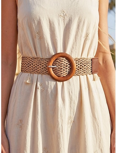 Cintura da donna in stile boho, intrecciata, elasticizzata e multicolore con fibbia rotonda in legno vintage, ideale per vacanze al mare, resort estivi e abbigliamento casual di tutti i giorni.