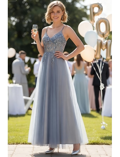 Linea ad A Tubino Colonna Lunghezza al pavimento Abito da Ballo Abito da sera Abiti da Ballo Elegante Festa Scintillante Senza Maniche Scollo a V Balli di fine anno Matrimonio Tulle con Pizzo Glitter