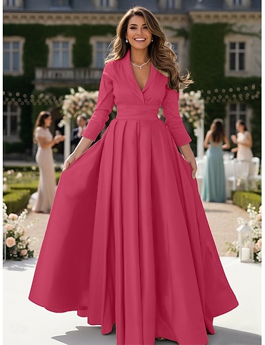 Linea ad A Lunghezza al pavimento Abito in Raso Vestito da Festa Abito da invitata a nozze Abito da cerimonia per signora Manica 3/4 Scollo a V Elegante Formale Raso con Fascia / Nastro Pieghe