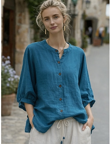 Blusa da donna in 100% cotone effetto lino di colore solidale quotidiana elegante basic a maniche 3/4 girocollo regolare top quotidiani blu nero bianco giallo rosso primavera autunno