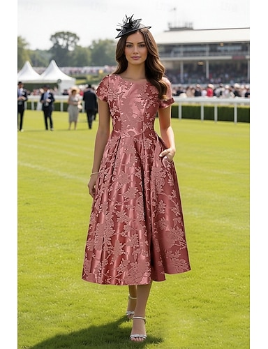 Linea ad A Lunghezza Tè Abito Formale Abiti da Cocktail Elegante Manica Corta Scollo a Barca Matrimonio Formale Tasca Jacquard con Pieghe Arricciato
