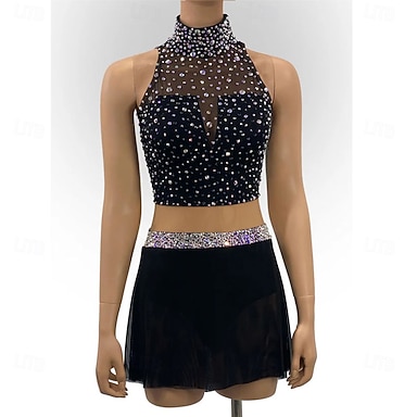 abito da pattinaggio artistico, abito da pattinaggio sul ghiaccio da donna e da ragazza, nero, abbigliamento da pattinaggio per allenamento e competizione, termico, caldo, con cristalli/strass, senza