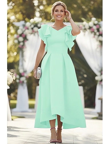 Linea ad A Asimmetrico Vestito da Festa Abito da Cocktail Abito da invitata a nozze Abito da cerimonia per signora Manica Corta Scollo a V Elegante Alto Basso Raso con Volant