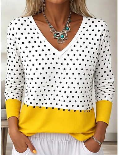 Per donna Maglietta Stampato Grafico A Pois Blocco di colori Elegante Classico Casual Manica Lunga Scollo a V Top Regolari Quotidiano Giallo Primavera Autunno