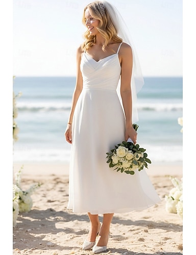 Linea ad A Lunghezza Tè Abito Bianco Abiti da sposa Abito da sposa Piccoli Abiti Bianchi Senza Maniche Scollo a V Laurea Compleanno con Arricciato Farfalla Tinta unita