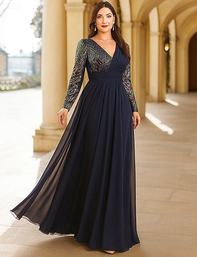 Abito da ospite per matrimoni in stile A-Line fino al pavimento Abiti formali Abito da sera Abito per la madre della sposa maniche lunghe scollo a V elegante vintage taglie forti paillettes con