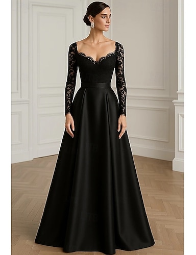 Linea ad A Lunghezza al pavimento Abito da Sera Da principessa Abito formale Elegante Setoso Manica Lunga Scollo a V Matrimonio Formale Tasca Raso Pizzo con Glitter