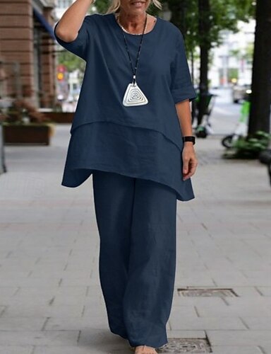Per donna Camicia Camicie di cotone e lino Set di biancheria Set 2 Pezzi Tinta unica Moda Casual Girocollo Quotidiano Streetwear Blu Bianco Cachi Grigio Estate Primavera Autunno Primavera & Autunno