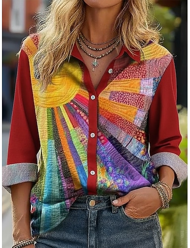 Per donna Camicia Finto cotone e lino Bottoni Stampato Grafico Graffiti Bohemien Attivo Casual Manica Lunga Colletto a Camicia Top Regolari Quotidiano Ferie Rosso Primavera Autunno