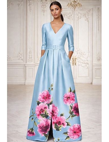 Linea ad A Lunghezza al pavimento Abiti da Cocktail Abito da Sera Abiti da festa Elegante Vintage Mezza Manica Scollo a V Matrimonio Formale Tasca Nylon con Stampa floreale