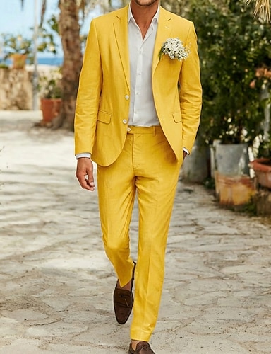 Uomo Completi in Lino Matrimonio in Spiaggia Casuale Giallo Rosso Primavera & Estate Tuta Bavero classico Moda Quotidiano Tinta unita Vestibilità su misura 2 pezzi Monopetto Due Bottoni