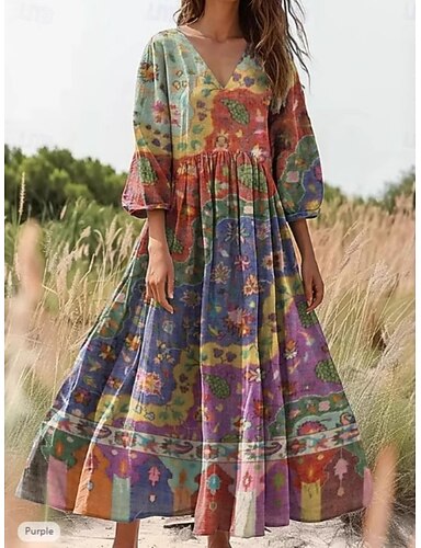 Per donna Abito Midi Abito Floreale Abito Stampato Moda Moderno All'aperto Vacanza Uscire Vestibilità comoda Floreale Manica 3/4 Scollo a V Blu Giallo Arancione Estate Primavera