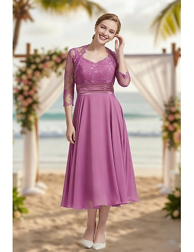 Due Pezzi Linea ad A Lunghezza Tè Abito da invitata a nozze Abito da cerimonia per signora Senza Maniche Manica 3/4 Scollo a Cuore Elegante Formale Ricevimento di matrimonio con Pizzo Fascia / Nastro