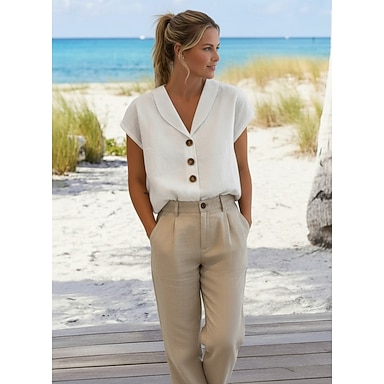 Da donna Set di Pantaloncini Finto cotone e lino Manica Lunga Colletto a Camicia Semplice Elegante Vacanza Vintage Casuale Quotidiano Vacanza Bianco Estate