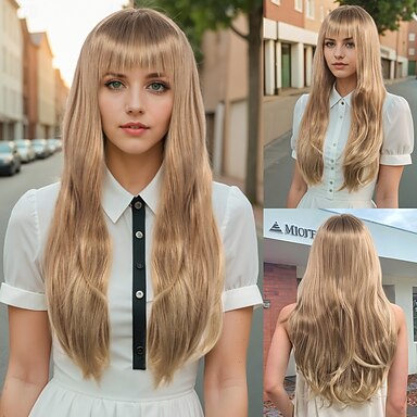 Parrucca Sintetica Ricci rimbalzanti Liscio Kinky Taglio Scalato Con Frangia Fatto a macchina Parrucca 24 pollici A1 Capelli Sintetici Per donna Classico Molto spesso Confortevole Biondo