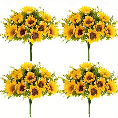 4 mazzi di girasoli artificiali, giallo brillante &Fiori di plastica verdi e resistenti per decorazioni interne ed esterne, perfetti per la casa, hotel, progetti fai da te, matrimoni, feste e