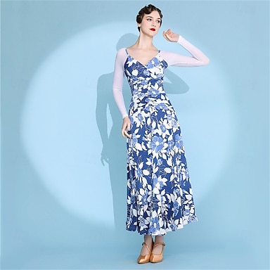 abito da ballo da sala con stampa floreale per donna - abito a trapezio a maniche lunghe con maniche trasparenti per competizioni, latino e eventi di danza - blu& bianco