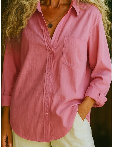 Camicia da donna in 100% cotone effetto lino con taschino di colore solidale bohemien vintage quotidiana a maniche lunghe colletto regolare top quotidiani vacanza blu bianco rosa rosso viola