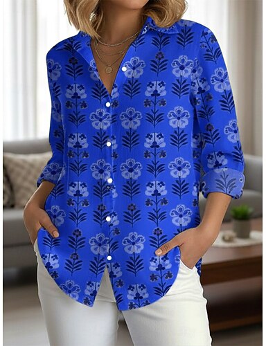 Camicia da Donna in Lino Simile Traspirante Leggero Grafica Floreale Vintage Giornata Casual Maniche Lunghe Collo Tops Regolari Giornata Festa Stampa Rosa Rossa Blu Fucsia Estate Primavera