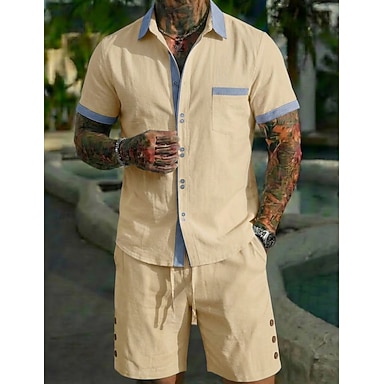 Per uomo Camicia di lino Due pezzi Set Camicia E Shorts Shorts di Lino Shorts da Spiaggia Impostare Colore a Contrasto Quotidiano All'aperto Vacanza Collo ripiegato Manica Corta Estate Moda Casual