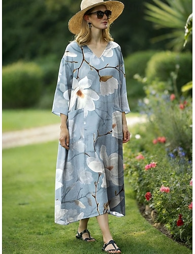 Abito lungo da donna in lino simile traspirante leggero abito a linea A abito da vacanza casual boho spiaggia vestibilità larga floreale grafica uccello a maniche 3/4 V collo blu rosa viola beige