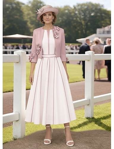 Due Pezzi Lunghezza alla caviglia Abito da invitata a nozze Abito da cerimonia per signora Manica 3/4 Collo gioiello Elegante Ospite di nozze Chiesa Raso Elasticizzato Gonne corte con Fiocco/Fiocchi