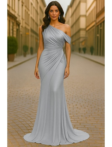 Sirena Tromba Tubino Colonna Lunghezza al pavimento Abito da invitata a nozze Abito Formale Abito da sera Abiti da Ballo Elegante Senza Maniche Monospalla Balli di fine anno Formale Chiffon Shiena