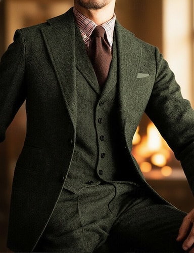 Uomo Completi in Tweed Matrimonio Cachi Verde militare Autunno Tuta Dentellato Bavero classico Quotidiano Affari Tinta unita Taglie Forti 3 pezzi Monopetto Due Bottoni