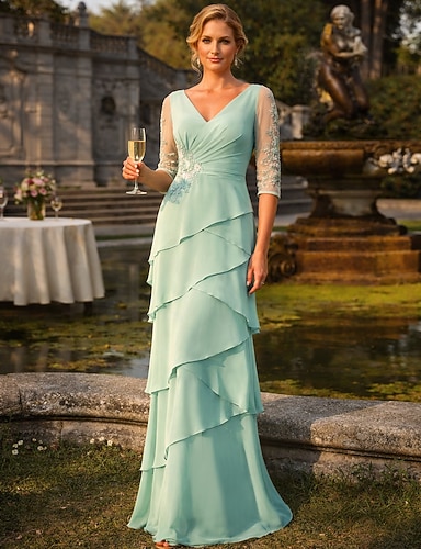Tubino Colonna Abito Lunghezza al pavimento Abito da invitata a nozze Abito Formale Abito a Strati Abito da cerimonia per signora Manica 3/4 Scollo a V Elegante Formale Chiffon con A balze Balze a